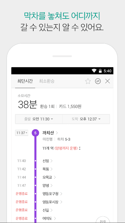 - 사용자의 검색 시점에 따라 급행노선을 포함한 최적의 경로검색 기능을 제공합니다.