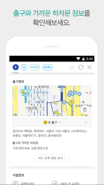 - 교통약자 이동·환승 경로와 역사 내 시설정보, 초 미세먼지 예보 등 역 정보로 상세하게 제공합니다.