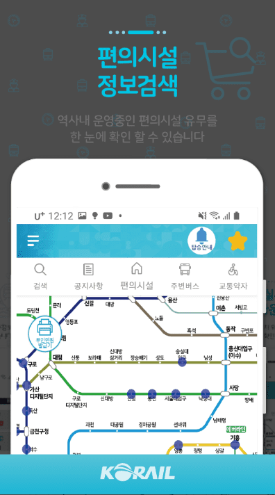 ■ 편의시설 : 게이트 내 화장실, 유아수유실, 무인민원발급기 , 주차장 정보를 노선도 기반으로 제공합니다.