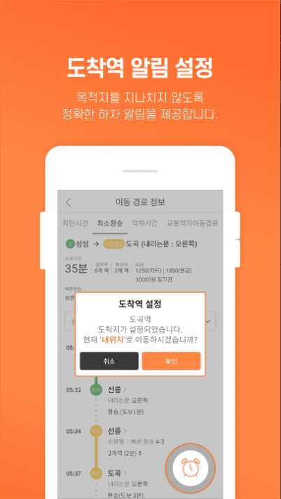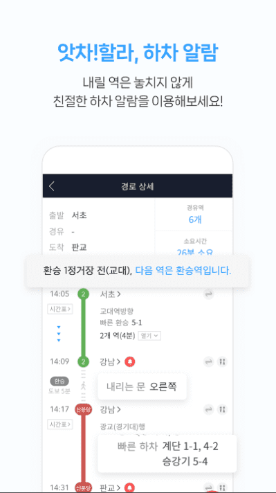 - 스마트한 하차 알람으로 하차하는 환승역과 도착역을 놓치지 않아요!
