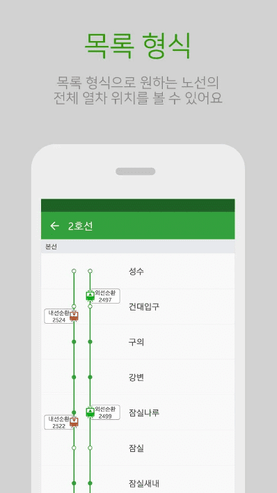 리스트 방식으로 노선 내 여러 열차의 위치를 확인할 수 있습니다.