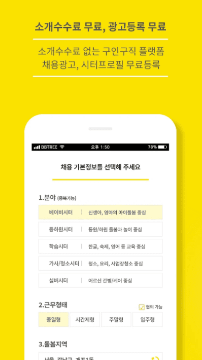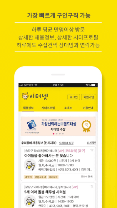- 워킹맘이라 아이를 봐주실 시터님 찾고있는데요, 시터 구인 조건을 선택할 수있게 됐어 좋았습니다. 앱이 깔끔하고 포인트 적립도 너무좋네요 ^^